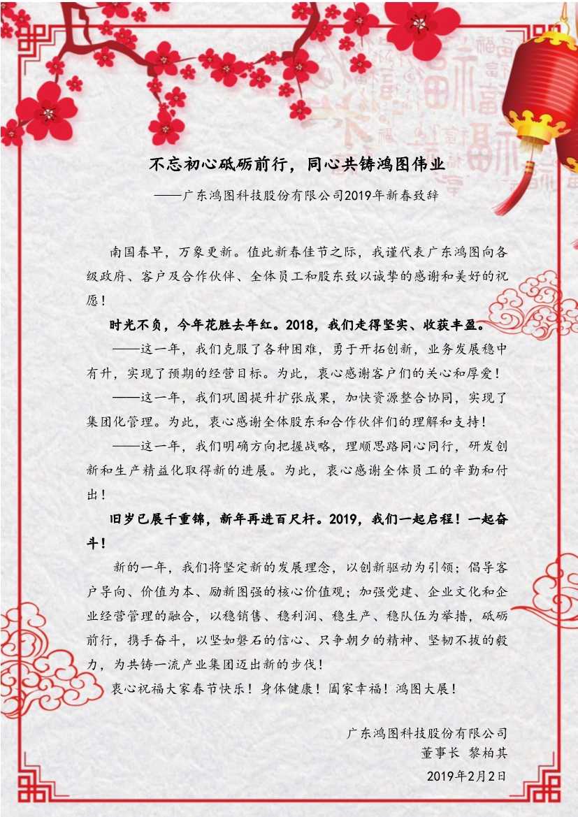 廣東鴻圖科技股份有限公司2019年新春致辭