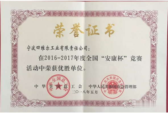 鴻圖科技子公司寧波四維爾認真貫徹落實上級開展“安康杯”活動文件精神,切實加強企業(yè)勞動保護工作,不斷推動公司“安康杯”競賽活動的深入開展,促進了企業(yè)不斷提高安全生產(chǎn)管理水平,增強了廣大員工自我保護意識,有效預防安全生產(chǎn)各類事故的發(fā)生,維護職工的安全保護合法權益,促進了企業(yè)和諧穩(wěn)定,被中華全國總工會、國家應急管理部授予2016-2017年度全國“安康杯”競賽活動優(yōu)勝單位。