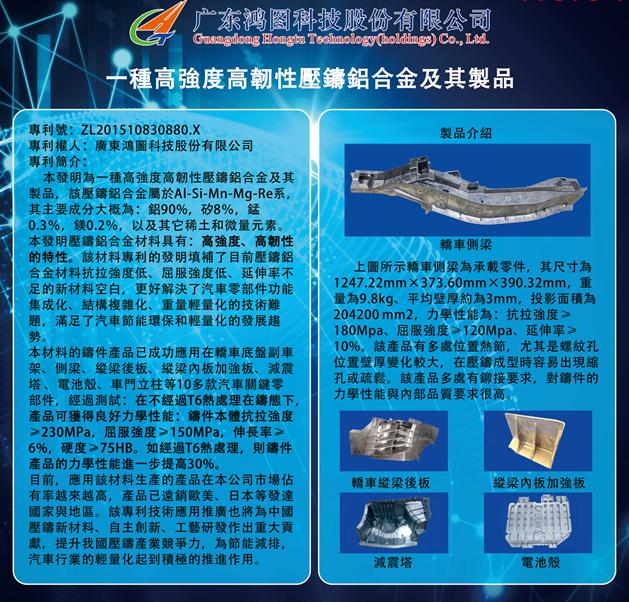 廣東鴻圖科技股份有限公司(以下簡(jiǎn)稱:鴻圖科技)攜自主研發(fā)的“一種高強(qiáng)度高韌性壓鑄鋁合金及其制品”參加本次評(píng)獎(jiǎng)活動(dòng)。該制品憑借優(yōu)秀的材料力學(xué)性能及在汽車關(guān)鍵零部件開發(fā)生產(chǎn)中的應(yīng)用價(jià)值獲得本年度亞洲國(guó)際創(chuàng)新發(fā)明大獎(jiǎng)“金獎(jiǎng)”。