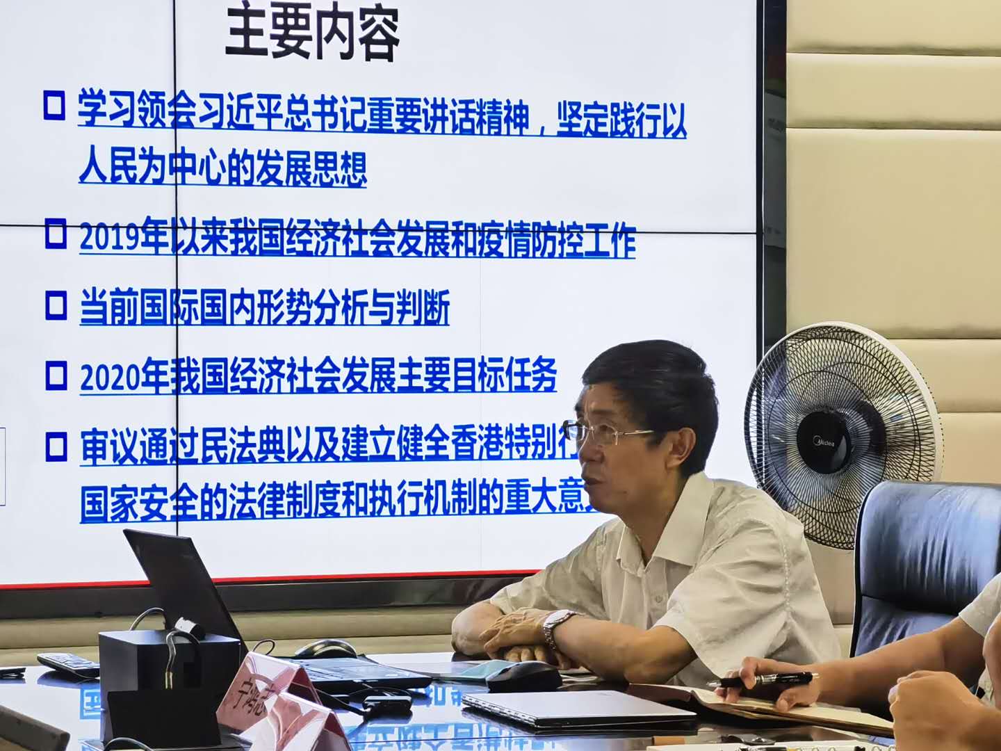余甫功教授從習(xí)近平總書記重要講話精神和以人民為中心的發(fā)展思想、2019年以來我國經(jīng)濟社會發(fā)展和疫情防控工作、當(dāng)前國內(nèi)外形勢分析與判斷、2020年我國經(jīng)濟社會發(fā)展主要目標(biāo)任務(wù)、審議通過《民法典》和“香港國安法”的重要意義等五個方面,通過深刻的理論分析和翔實的數(shù)據(jù)解讀,對全國兩會精神進(jìn)行了全面而深入的講解。