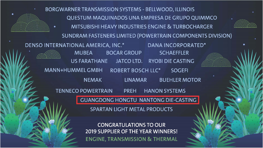 6月24日,我司全資子公司廣東鴻圖南通壓鑄有限公司被北美通用汽車評為2019年度優(yōu)秀供應(yīng)商,并參加了第28屆年度供應(yīng)商線上頒獎典禮。我司是第九次獲此殊榮,是通用汽車大中華地區(qū)獲獎次數(shù)最多的供應(yīng)商,同時(shí)也是通用汽車發(fā)動機(jī)、變速箱和熱管理組別配套企業(yè)中唯一獲獎的中國供應(yīng)商。