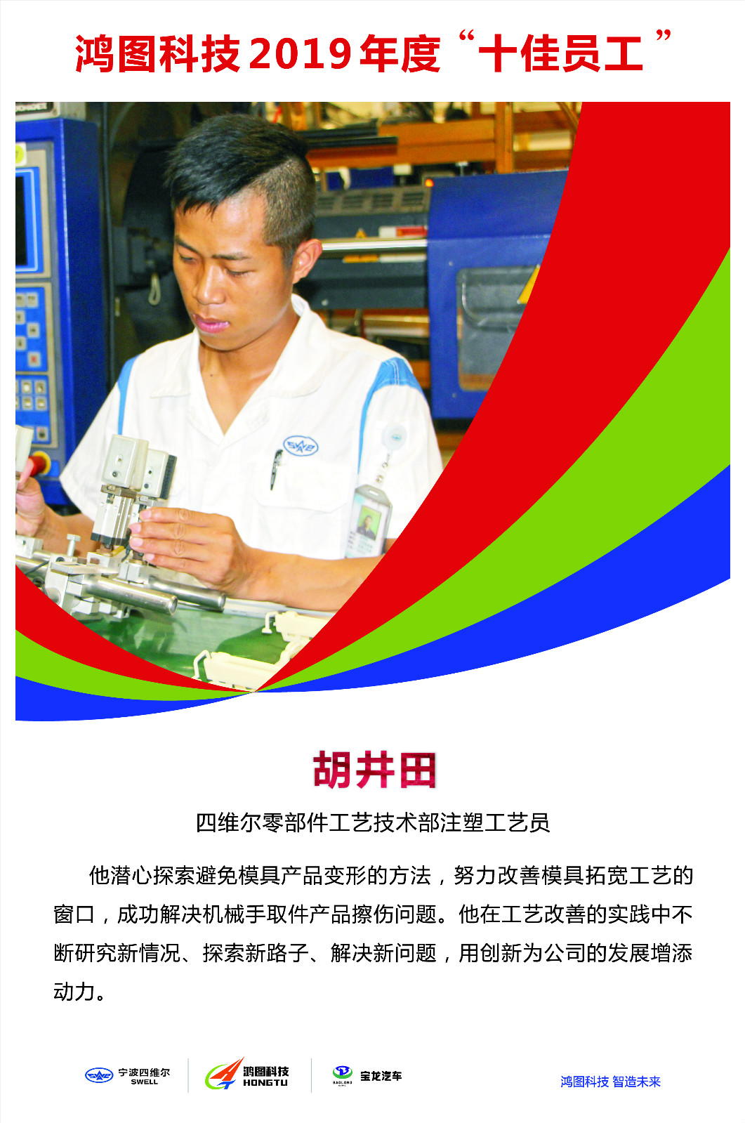 作為四維爾零部件工藝技術(shù)部注塑工藝員,入職以來,胡井田曾擔(dān)任過模具保養(yǎng)工、注塑班長、注塑工藝員等。在平凡的崗位上,他積極探索、努力改善,不斷創(chuàng)新、不斷進(jìn)步。