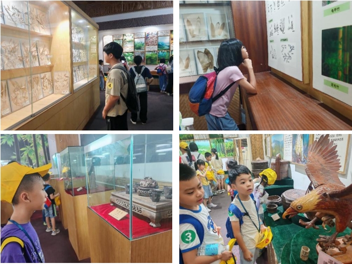 廣寧竹文化博覽館內(nèi)設(shè)有竹產(chǎn)品展示大廳、竹箸館、竹雕精品館、竹書館、竹標(biāo)本館、竹文房用具館六大主題分館。展覽體系完整、內(nèi)容豐富,涵蓋了竹的生物特性、歷史淵源、工藝傳承、文化藝術(shù)、生活應(yīng)用諸多方面?;顒?dòng)當(dāng)日上午,孩子們一踏入竹文化博覽館,便被撲面而來(lái)的竹香和深邃的文化氛圍所吸引。在講解員的引導(dǎo)下,他們穿行于各館之間,通過(guò)不同主題的展館和竹藝作品,直觀感知“竹全身是寶”的生態(tài)價(jià)值與文化意義,進(jìn)一步理解了竹資源在地方經(jīng)濟(jì)發(fā)展和傳統(tǒng)工藝延續(xù)中發(fā)揮的重要作用。